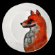 Hand-painted majolica dinner plate with a white background and decorated with a fox head.